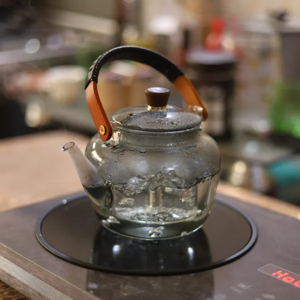 قوري مصنوع من الزجاج المقاوم للحرارة ( بايركس ) بلون اسود خفيف, ياتي مع مصفيين زجاجيين و مقبض خشبي مغلف بالجلد